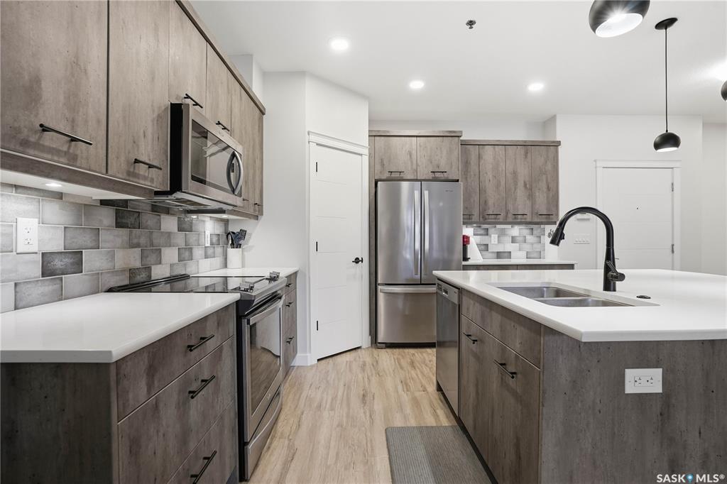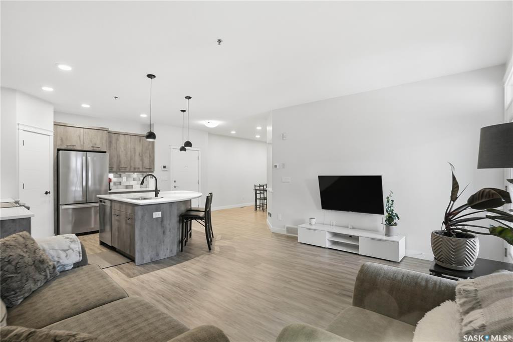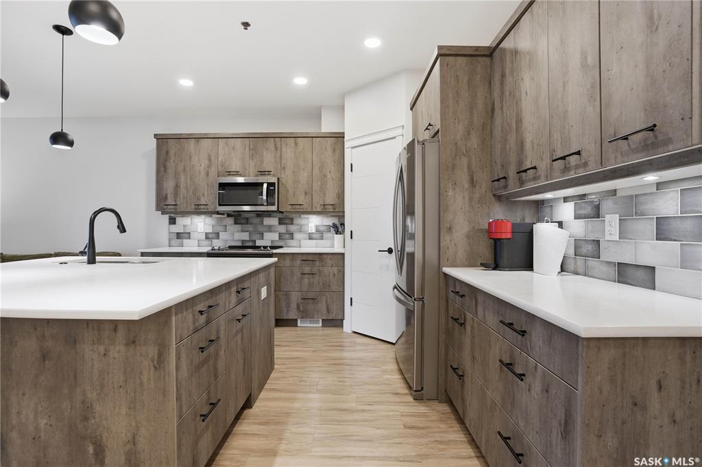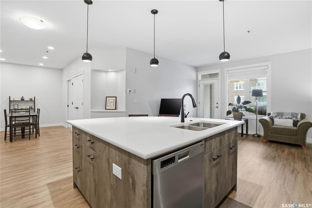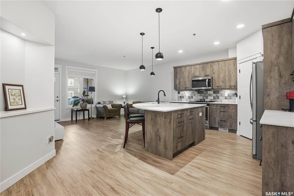 Welcome to this beautifully finished 1,130 sq ft condo offering 2 bedrooms and 2 bathrooms with a bright, open-concept layout. Wide plank vinyl flooring runs throughout the majority of the unit, creating a modern and cohesive feel. The stylish kitchen features white granite countertops, a large island with seating, stainless steel appliances, corner pantry, tiled backsplash, and striking black pendant lighting above the island. The living room offers a patio door leading to your private balcony, while the d...